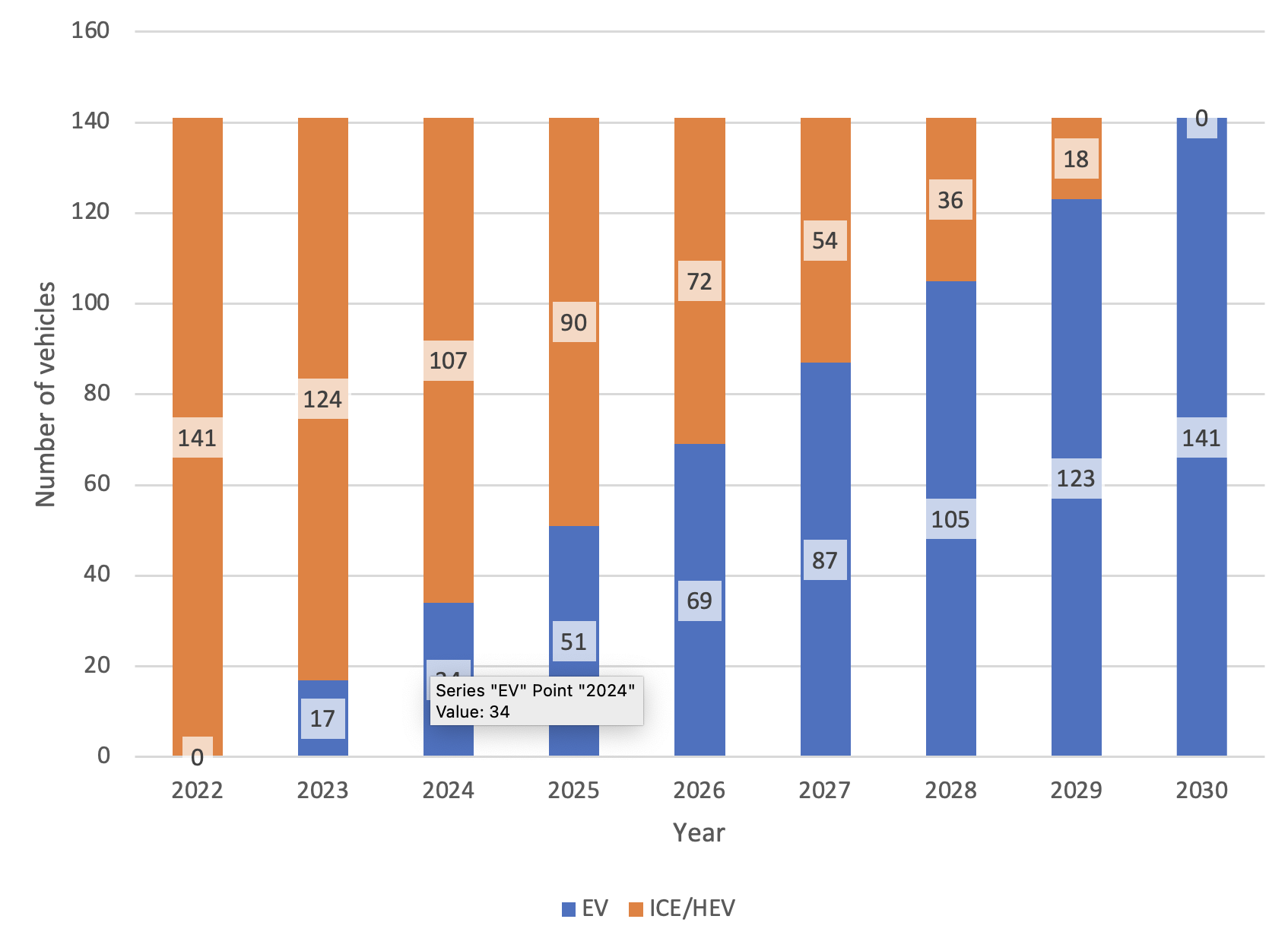 Each of the councils included in this project was provided with a transition pathway. The graph below provides a conceptual illustration of the transition from internal combustion engine (ICE) vehicles to EVs, on a year-by-year basis. This shows both a delayed start and an immediate transition pathway.